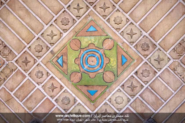دیواره های پیرامونی با نقوش هندسی در لایه ها و رنگ های متفاوت اجرا و تزیین شده اند. نوارهای افقی که نقوش هندسی مانند دایره و مربع به رنگ های آبی و کرم و قهوه ای در آن ها طراحی شده است، نخستین لایه را می سازند. دومین لایه، شبکهای لوزی شکل است، که حاشیه درون هر لوزی از آجر لعابدار آبی رنگ، تشکیل شده است. ترکیب این لایه ها، سطوح تزیین، با ترکیب رنگی متنوع کرم، آبی و قهوه ای رنگ، به وجود آورده است.
